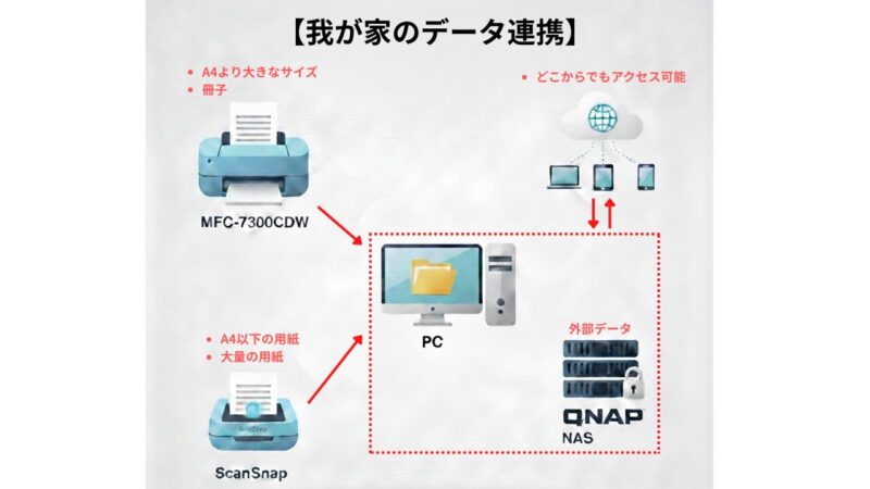 我が家はスキャンをする際、以前から持っていたスキャナ専用機:「ScanSnap」と併用し、さらに家庭用サーバーの「NAS」でどこからでも参照できるようにしています。